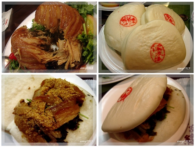 從中間直接剖開,就看到一層層的焢肉裡包著梅干菜。拿起店家給的刈包,放入梅干菜、焢肉、香菜跟花生粉,再淋上點醬汁,好吃的成品就大功告成了。張大嘴咬一口,滿嘴的料香,配著餅皮,聽到"oishii",amy很高興Kioy跟加藤先生喜歡這道菜。
