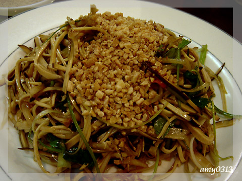涼拌干絲/老闆招待。大溪土產黑豆干做的涼拌干絲,有著較明顯的豆香,配上略酸的醬汁跟大量的花生粉,吃起來確實與眾不同。