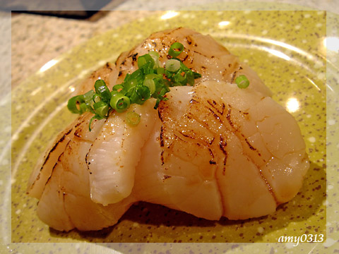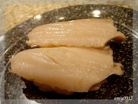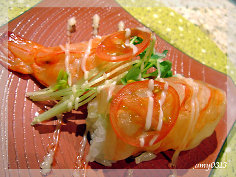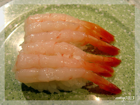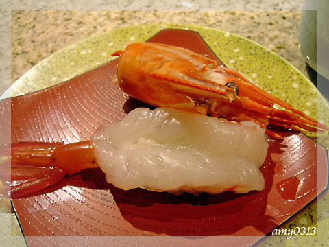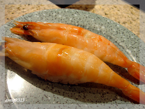 這個牡丹蝦是amy第一個拿的,愛吃牡丹蝦的amy看到這樣一大隻的牡丹蝦就覺得好讚哦,一口咬下去,蝦肉的甜美跟微溫的壽司飯真的一大享受。