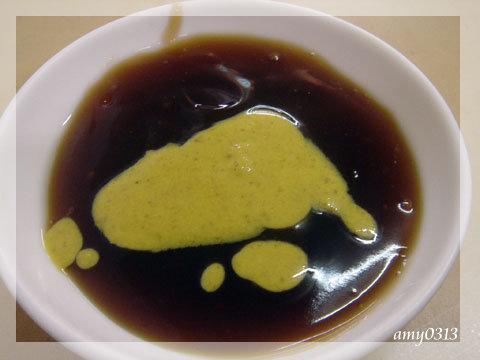 阿龍的沾醬是醬油膏加上黃芥末,口味比較偏甜的那種,深得anthony的喜愛,amy問了店家後得知是用東成的醬油膏,家裡剛好有,於是上週末就去買了黃芥末,打算自己來調調看呢~。