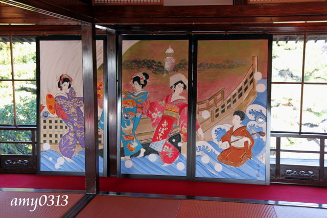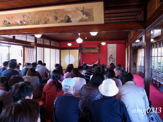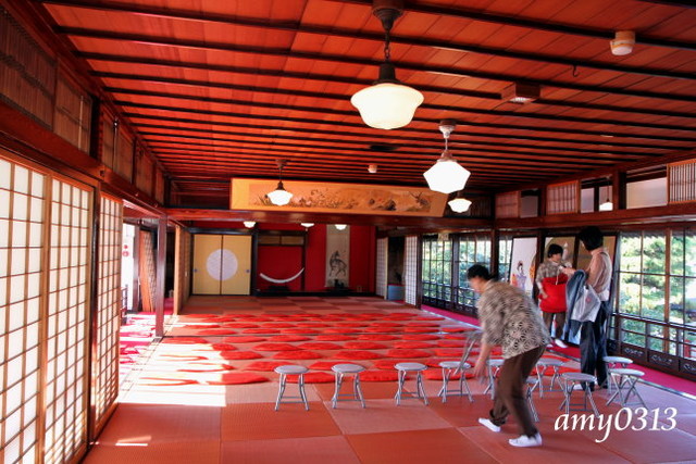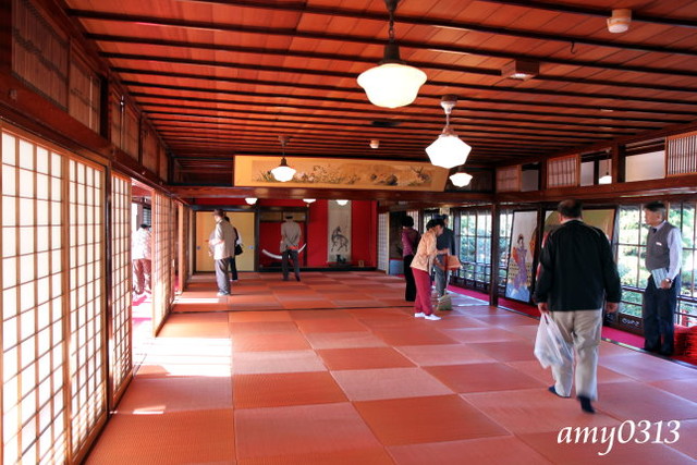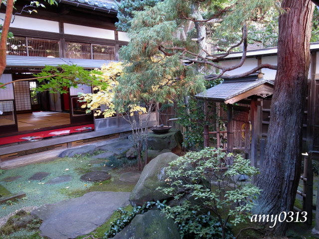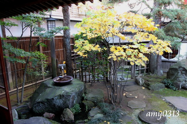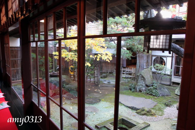 "相馬樓"其實不大,裡頭幾個房間展示著古代藝妓文物與畫展,大多都不能拍照。大家拿著相機都覺得很無趣,於是全擠到這個唯一能拍照的庭院來。