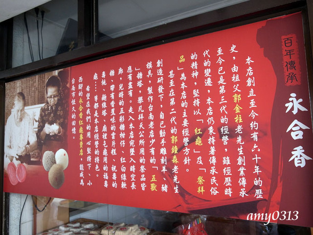 『永合香餅舖』已經走過了一甲子,目前傳到第三代,秉持著傳承民俗的精神,以"紅龜"和"祭拜品"為主要的經營方針,希望能成為台南人永恆的回憶。